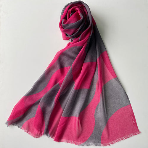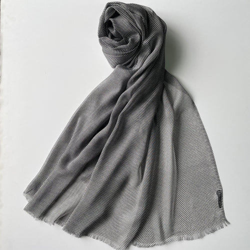 光の具合でストールの表情が変わります。素材はシルク100%、あるいはシルク50%カシミヤ50%で、優しい肌ざわりの大判ストールです。